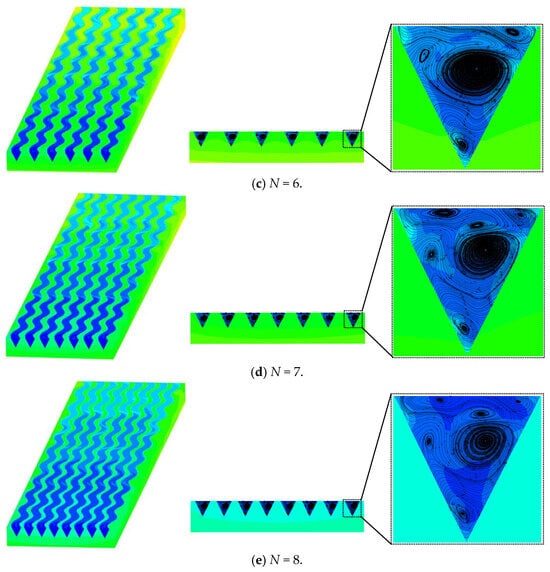 (3) At the same pump power, both the heat transfer area and the total Dean Vortex number increase with the increase in N, leading to a decrease in the thermal resistance R and the maximum temperature Tmax. In the present study, both the thermal resistance R and Tmax reach their minimum values when N = 8.