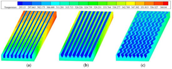 Temperature contours of (a) RSM heat sink, (b) VSM heat sink and (c) VWM heat sink.