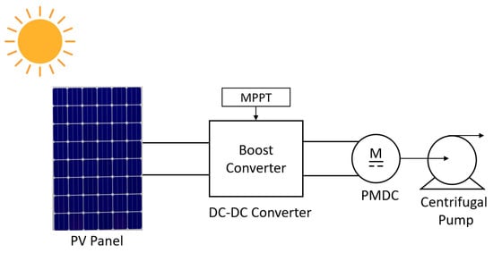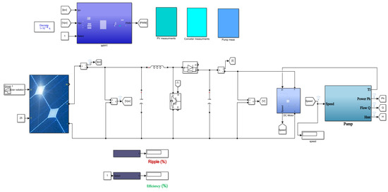 In this system, the photovoltaic array, the primary energy source, converts solar radiation to direct current electrical power. This produced power depends heavily on the irradiance and temperature conditions. The produced energy is fed into an MPPT boost controller, which employs the chosen maximum power point tracking algorithm to ensure that the PV array operates at its maximum efficiency while stepping up the DC voltage to match the requirements of the connected load. The power is then supplied to a permanent magnet DC motor that efficiently converts electrical energy into mechanical energy. This motor drives a centrifugal pump, transferring rotational motion to create fluid flow. The pump drives water through the hydraulic circuit that is designed to deliver water to the desired location, typically for irrigation or storage, while accounting for head pressure and flow rate requirements. These parts work together to make a system that efficiently converts solar energy into hydraulic energy for pumping water. In our instance, irrigation was in hard-to-reach rural places.