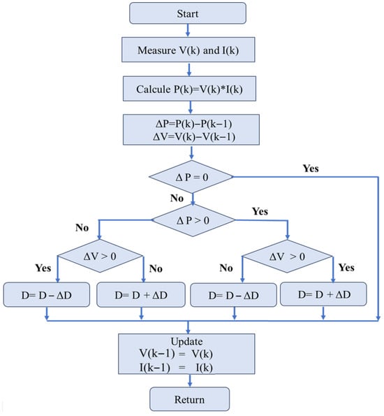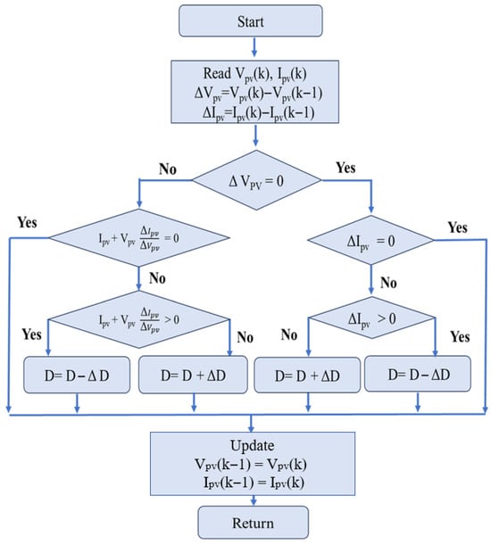 This method dynamically adjusts the duty cycle to track the maximum power point of the PV module, making sure that the converter consistently delivers the maximum possible power to the load. The flowchart of this method is represented in Figure 5.
