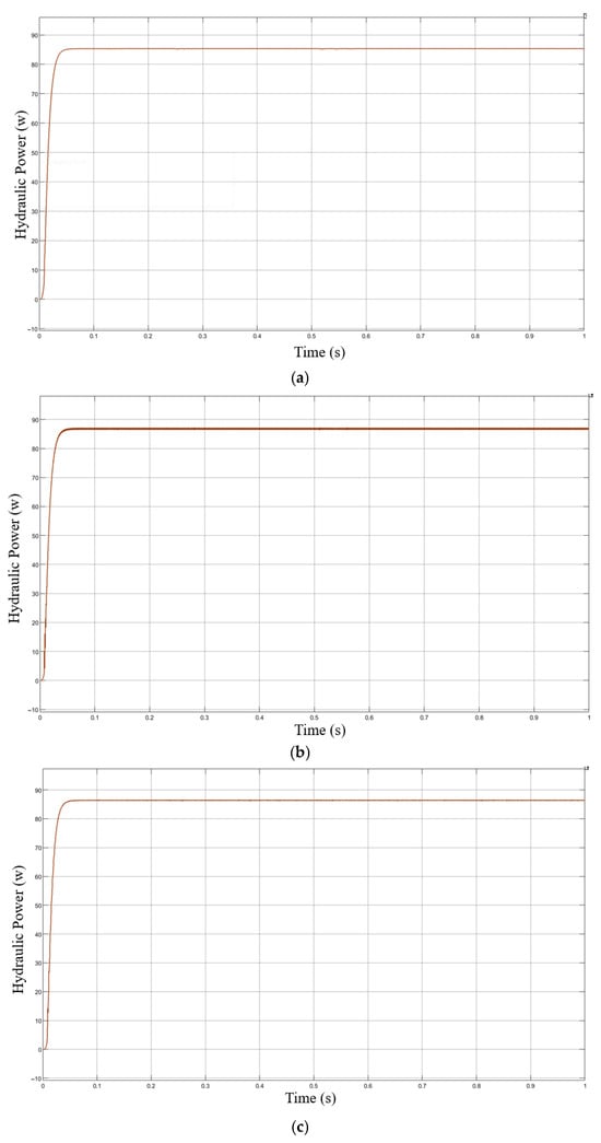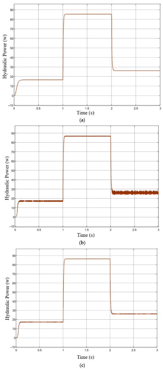 Hydraulic power response over time using different MPPT methods under an irradiance of 1000 W/m2: (a) incremental conductance (INC), (b) Perturb and Observe (P&O), and (c) hybrid approach.