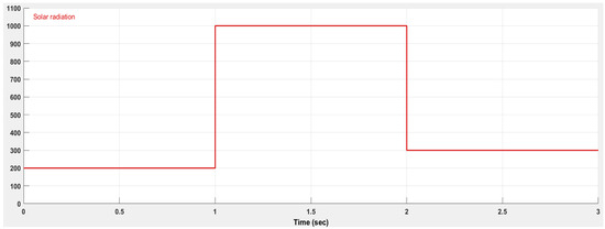 To further test the system’s performance, the PV panel was exposed to different sunlight levels as shown in Figure 9. The irradiance profile used in this study (200 W/m2 → 1000 W/m2 → 300 W/m2) was chosen to assess the MPPT algorithms under varying conditions, including low-light startup, full sunlight, and a sudden irradiance drop. This allows for the evaluation of the tracking speed, ripple behavior, and robustness of each method.