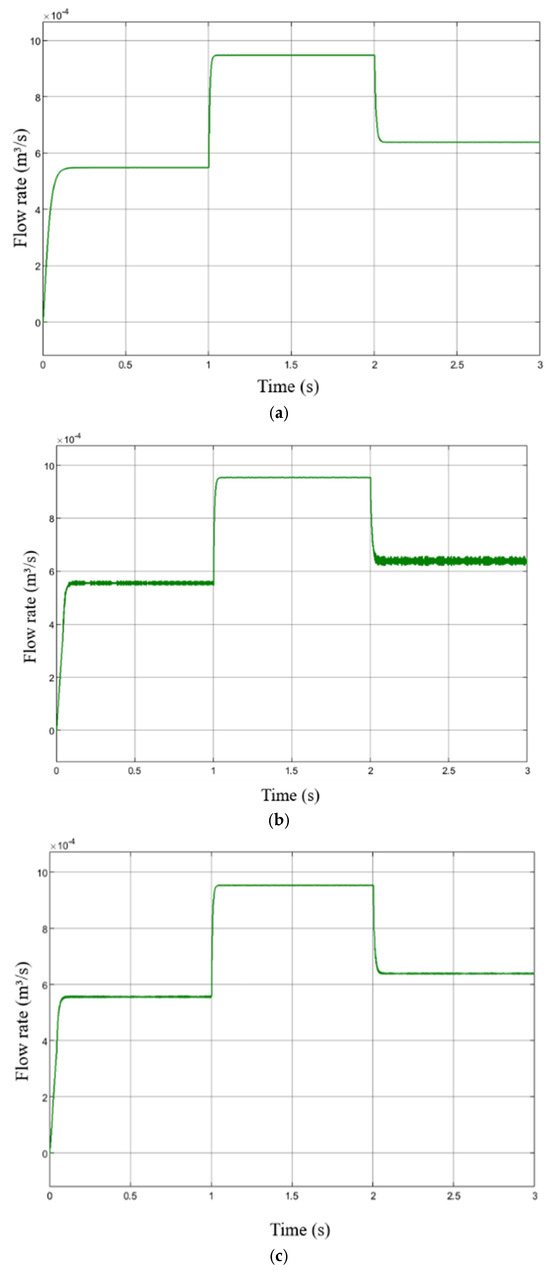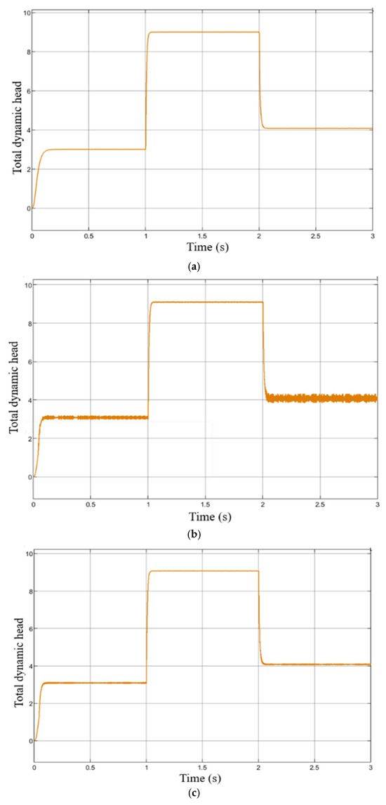 The hybrid approach, integrating the fast tracking of P&O with the ripple-damping accuracy of INC, emerged as the most effective compromise. Its adaptive switching mechanism enabled quick convergence during initial transients and stable operation around the MPP. Notably, at low irradiance (200 W/m2), where energy availability is critical, it preserved system efficiency at 49.5% with only 4.13% ripple, ensuring smooth hydraulic profiles with minimal fluctuations, as shown in Figure 10c. Although the hybrid algorithm requires more development effort and slightly higher computational resources, this added cost can be justified by the gain in system reliability and energy harvesting. Moreover, by reducing oscillations and protecting mechanical components from premature wear, the Hybrid controller may reduce long-term maintenance and replacement costs, thus proving more economical over the system’s lifecycle. Table 1 bellow summarizes briefly the findings.