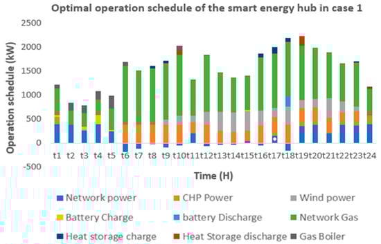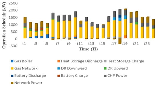 Given the perceived higher cost of natural gas in this scenario, the suggested energy hub should be billed at USD 0.055 for each kilowatt of gas it consumes from the network. Additionally, in this instance, the power and gas boiler network acts as a backup system if the CHP is not built, with the CHP functioning as the main source of heat and electricity at the proposed energy hub. The numerical results for this situation are shown in Figure 5. Figure 5 displays the optimal operating schedule for the energy hub’s performance over the course of a day.