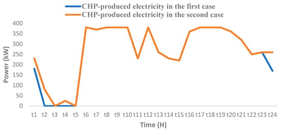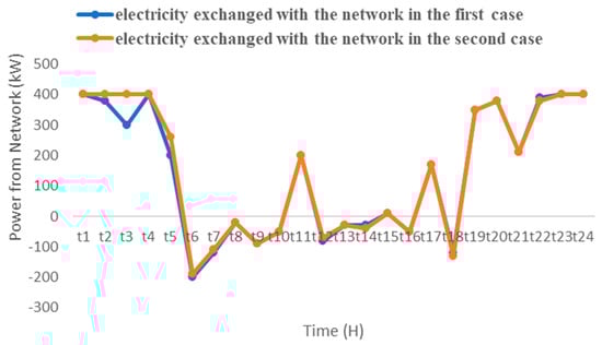 If the electricity exchange curve for the low fuel price mode is taken into consideration, as shown in Figure 17, it can be demonstrated that the power purchase from the grid in the scenario of utilising CHP is cheaper than the scenario of eliminating CHP at all times of the day. It can be argued that the utilisation of natural gas for electricity production and the load shifting to low-cost times often cause the consumption curve in this scenario to flatten. Furthermore, even while petrol consumption rises during peak electricity hours and less electricity is bought from the grid during these periods, the cost of the consumers’ energy bills decreases. From a financial perspective, the electrical grid’s daily expenses decrease due to the flattening of the curve and reduced production and transmission costs, while the profit margin of the gas firm increases with increased sales of natural gas.
