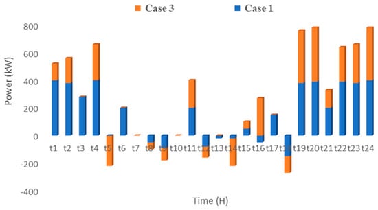 Another problem is the decline in boiler manufacturing. The increased production of CHP reduces the need for auxiliary sources and the use of boilers. Additionally, as the amount of thermal energy generated by CHP rises, so does the requirement for thermal storage. This is because CHP production is linked with the thermal demand pattern. In this case, when the CHP production exceeds the heat requirement, the heat storage is replenished periodically during the day, and when it is released, it not only meets a significant amount of the thermal demand but also eliminates the need for boilers. Figure 5 and Figure 9 illustrate that the heat storage has a charge and discharge power that is more than twice that of Scenario 1. Reliance on the electrical grid and the quantity of electricity network purchases will decrease with the adoption of natural gas as an energy source and its continuous use. For a more precise comparison, see Figure 11. Figure 11 shows how to exchange electrical power with the network in Scenarios 1 and 3.