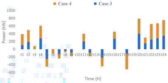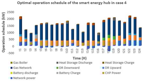 The graph clearly shows a decrease in purchases from the electrical grid, especially in the morning and evening. This is seen in Scenario 1; purchasing electricity from the grid was more cost-effective at the time than producing power using natural gas. In contrast, CHP meets the need for these hours in Scenario 3, and because natural gas prices have decreased, some of this demand is fulfilled by purchases made from the network. Thanks to improved CHP power generation, it is now viable to sell electricity to the grid even during the middle of the day. The energy hub’s operating costs have dropped significantly, to 65,094.2 M/USD as seen in Table 1, because of increased use of more cost-effective energy carriers, less reliance on the power grid, and enhanced ESS performance in this scenario. The following example, in which natural gas is a cheap energy source, looks at the effects of DR participation.