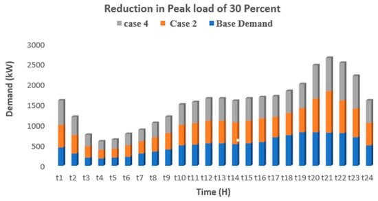 In this instance, like in Scenario 2, some electricity consumption is shifted from network peak hours to off-peak hours. The effects of demand variations on the demand curve for electrical energy in Scenarios 2 and 4 are shown in Figure 13.