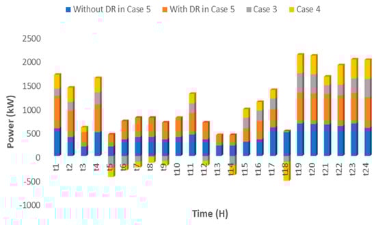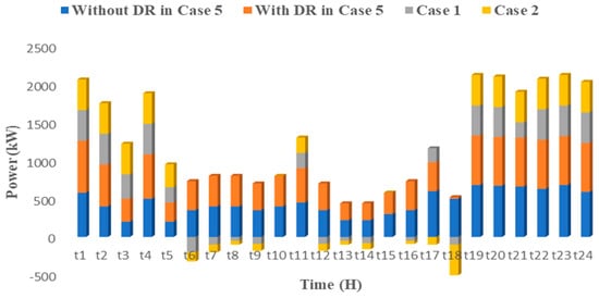 Here, we will assume that the energy hub under investigation does not have CHP and instead gets its power from the grid and wind turbines. Thermal energy will be produced by the boiler. In this scenario, the integration of several networks through multiple energy carriers is lost, making the direct acquisition of power-generating units from the relevant network necessary to satisfy fluctuating demands. We then contrast this scenario with two previous ones that had two high and two low natural gas prices. Figure 15 shows how to exchange electricity with the network in Scenario 5, as opposed to Scenarios 1 and 2. In Scenario 5, if the DR program is not carried out, the largest electricity purchase is scheduled to correspond with the energy’s peak price (i.e., the network’s peak demand), which elevates the network’s peak demand and rises operational costs for customers.