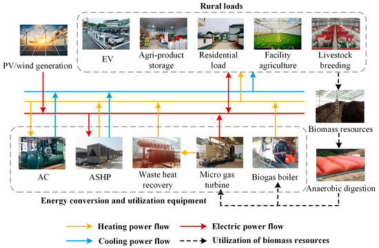 Rural areas possess abundant wind, solar, and biomass resources. In recent years, the installed capacity of renewable energy has increased rapidly. During peak generation periods, reverse power flow occurs in some areas, compromising grid stability [3,4]. On the demand side, the large-scale emergence of new loads, such as facility agriculture and electric vehicles (EVs), has imposed new requirements on energy supply. Under these new circumstances, rural micro-energy grids (RMEGs), serving as a rural energy system that enables the efficient complementary utilization of electricity, heating, cooling, and other energy forms, have gained significant attention for their role in renewable energy integration and multi-energy coupling [5,6].