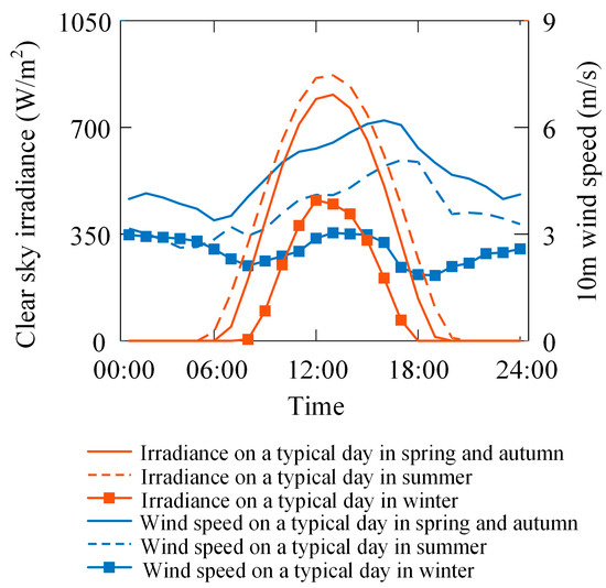 Variation in irradiance and wind speed on typical days.