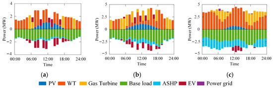 The simulation results of the electrical load for typical days across different seasons are shown in Figure 6. The vertical axis in the figure is divided into two directions. The upward direction represents the power supply, while the downward direction represents the consumption of various loads. Regarding load composition, the cooling load in summer and the heating load in winter constitute a high proportion, resulting in a significantly increased electrical load due to ASHP operation. Regarding power generation, grid purchases account for only 0.24% of the annual load demand. The three villages basically achieved self-sufficiency in electricity supply by relying on renewable energy throughout the year. PV generation is fully utilized during daytime, while WT and biogas power generation dominate the nighttime supply. Furthermore, PV generation in North China during winter is constrained by low temperatures and low solar irradiance, contributing only 4.35% to the total demand. Consequently, even during the daytime, wind power and biogas power generation serve as the primary power supply.