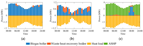 The heating demand in winter and in summer differs significantly, resulting in pronounced fluctuations in the heating load. As shown in Figure 7, the peak heating load in winter reaches 5.83 times that in summer. Consequently, the structures for heating supply exhibit distinct patterns between these two seasons. The figure indicates that biogas boilers and waste heat recovery units are the heating sources in spring, summer, and autumn. In winter, however, 83.51% of the biogas is utilized by gas turbines to compensate for the reduction in PV output. Only 16.49% of the biogas is allocated for heat production, as ASHPs displace biogas boilers to become the primary supply for winter heating.