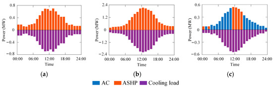 Figure 8 shows the variation in the cooling system in each season. Affected by temperature, the cooling and heating demand trends in winter and summer are opposite to each other. The peak cooling demand of summer is 3.96 times that of winter. In spring, summer, and autumn, ASHPs undertake the cooling task. In winter, however, ASHPs operate primarily in the heating mode, supplying only 35.89% of the total cooling demand. ACs meet the remaining 64.11%.
