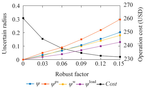 In the proposed MV-RMEG planning method, the robust factor and weight coefficients for uncertain radii are critical for addressing uncertainties. When the robust factor π varies between 0 and 0.15, the solution results of IGDT show a trajectory as depicted in Figure 9. It is evident that the uncertain radii demonstrate a positive correlation with π. This occurs because an increase in π elevates the total planning cost under IGDT, necessitating larger uncertain radii to accommodate more adverse DG output conditions. A comparative analysis reveals that the uncertainty radius of PV exceeds that of WT. This indicates that PV fluctuations exert a comparatively smaller impact on MV-RMEG planning. This phenomenon primarily stems from the selected region’s shorter daylight hours and lower temperatures during winter. Consequently, the results demonstrate that the MV-RMEG exhibits greater sensitivity to the adverse conditions of WT output. In contrast, the impact of load is much more profound than that of DG. The proposed method is compared with the deterministic optimization method based on predicting information (i.e., π = 0). Monte Carlo simulation (MCS) is used to randomly generate forty scenarios of DG output and load. The daily operation cost is tested with different values of π. As shown in the figure, the overall operating cost decreases as π increases. The deterministic method fails to take into account the possible random fluctuations. Therefore, the planning result is overly aggressive, resulting in excessively high costs. However, when the π is too high, it will result in redundant capacity of the RMEG equipment, leading to a convergence in costs.