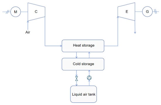 Recognizing the limitations of conventional compressed air energy storage (CAES) technologies—including bulky infrastructure demands, low energy density, and geographical constraints—researchers have developed a modular and scalable liquid air energy storage (LAES) system that operates through air liquefaction [26]. The working principle of LAES is shown in Figure 4: (1) During energy storage, compressed air rejects heat to high-temperature thermal storage devices and then absorbs cryogenic energy from cold storage devices and further achieves liquefaction for tank storage throttling valve expansion. (2) During energy discharge, the liquefied air is pressurized by a pump and then evaporated and heated by cold and hot storage devices. The resulting high-pressure air drives turbines for electricity generation. LAES is also considered one of the CB technologies.