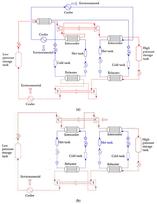 Current energy storage technologies encompass mechanical storage (e.g., pumped hydro energy storage [PHES], flywheel energy storage), thermodynamic storage (e.g., compressed air energy storage [CAES], compressed CO2 energy storage [CCES], Carnot batteries [CBs]), and electrochemical storage (e.g., lithium-ion batteries, flow batteries). PHES and thermodynamic approaches exhibit superior performance for grid-scale, long-duration storage applications [6,7,8,9,10]. While PHES currently represents the predominant installed capacity worldwide, its widespread adoption faces significant limitations, including stringent geographical constraints, extended project implementation periods, and substantial infrastructure costs. Thermodynamic systems utilizing gas compression present distinct advantages by eliminating hydrological dependencies. The modular nature of their fundamental components—compressors, expansion turbines, and pressure vessels—enables flexible deployment across various topographies, particularly demonstrating operational viability in planar regions and industrial complexes [6,7,8,9,10,11].