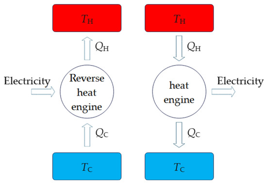 Carnot battery (CB), an emerging large-scale energy storage technology, achieves energy storage and release through efficient bidirectional conversion between electrical and thermal energy. CB is geographically unrestricted while offering advantages such as high RTE, large capacity, long lifespan, and rapid response. As illustrated in Figure 7, the CB operates as follows: during charging, electrical energy is utilized to establish a temperature gradient between two thermal storage units; during discharging, this gradient drives a power cycle for electricity generation. Consequently, the CB’s charging/discharging processes correspond to forward and inverse conversions of electrical-to-thermal energy, respectively, with energy storage achieved via thermal storage units (TES) [6,8,11,12].