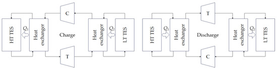 Forward/reverse Brayton cycle CB operates via reversible Brayton cycles between cold and hot thermal storage units, as illustrated in Figure 8. During charging, the working fluid (typically argon or helium) undergoes pressurization-driven compression, transferring thermal energy from the low-temperature (LT) TES to the high-temperature (HT) TES reservoir while consuming net electrical input (compressor work > turbine output). Conversely, discharge leverages the established thermal gradient to drive expansive turbine operations, yielding net power generation (turbine output > compressor work). Studies indicate that helium outperforms argon due to lower pressure losses and superior operational stability. Additionally, working fluids such as air, supercritical CO2, hydrogen (H2), and nitrogen (N2) have been investigated. Research demonstrates that air, when coupled with electric heaters, achieves a higher power output and efficiency compared to argon [6,22,24].