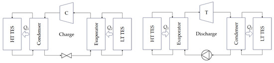 The term “Carnot battery” encompasses diverse storage technologies, including, but not limited to, pumped thermal energy storage (PTES), the Lamm–Honigmann system (LHS), liquid air energy storage (LAES), systems integrating resistive heating with power cycles, and hybrid configurations. This paper focuses on PTES and electrothermal storage systems. Charging methods in such systems include electric heating, conventional heat pump cycles (HP), and reverse Brayton cycles (Brayton heat pumps), where conventional HP typically refers to reverse ORC systems unless otherwise specified. Discharge cycles primarily involve Brayton cycles, Rankine cycles (typically subcritical), and transcritical Rankine cycles, with working fluids such as water or organic substances for Rankine cycles and CO2 for transcritical cycles. System architectures combine charging/discharging components into the following primary configurations: electric heater–Brayton, electric heater–Rankine, reverse Rankine–Rankine, reverse Brayton–Brayton, reverse Brayton–Rankine, and reverse open Brayton–Rankine systems [6,8,11,12].