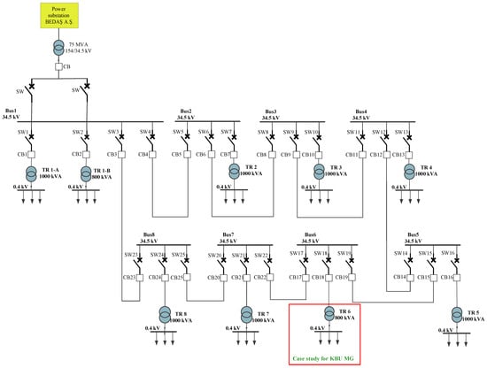 The Karabük University Demir Çelik campus’s electricity distribution network is supplied by the medium-voltage (MV) network of BEDAŞ Electricity Distribution Corporation. The MV line enters the university, passes through busbars in the MV distribution building, and is then transmitted to the campus’s MV distribution lines before connecting to its low-voltage network. The single-line diagram of the KBU Demir Çelik campus is illustrated in Figure 2.