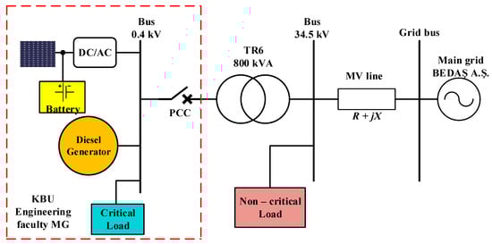 The engineering faculty building of KBU Demir Çelik campus is chosen as a case study for the hybrid MG. This MG is a hybrid power system that integrates multiple DGs. The parameters of the hybrid KBU MG system are presented in Table 4. The structure of the KBU engineering faculty’s MG in grid-connected mode is shown in Figure 3 [].