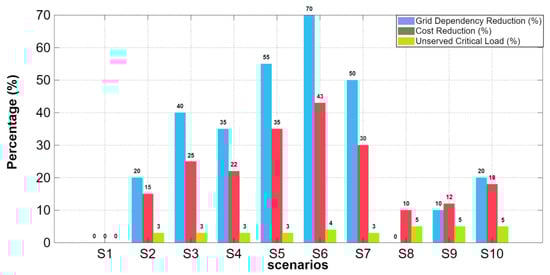Comparative summary of cost reduction, grid dependency reduction, and unserved critical load across ten stress-test scenarios using the proposed MPC strategy.