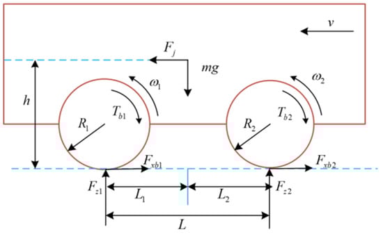 Assuming that the vehicle travels on a horizontal straight road surface, while not considering its lateral force and resistance during operation, the wheels on both sides of the coaxial bear the same load, and the tires have the same mechanical properties. Then the 1/2 wheel braking model is shown in Figure 1. Under the action of braking force, the speed of the vehicle will gradually be zero, and the kinetic equations satisfied in this process are []: