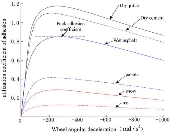 Table 1 presents typical values of and for several common road surfaces [,]. Figure 2 illustrates the relationship curve between wheel angular deceleration and the utilization coefficient of adhesion.