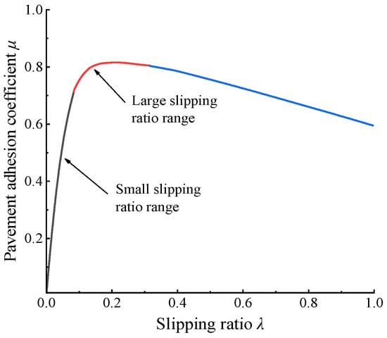 Figure 3 shows the μ-λ curve of the tire. In the small slipping ratio range (0–10%), the slopes of the μ-λ curves vary across different road surfaces. By fitting the slope within this small-slip region, the pavement adhesion coefficient can be estimated.