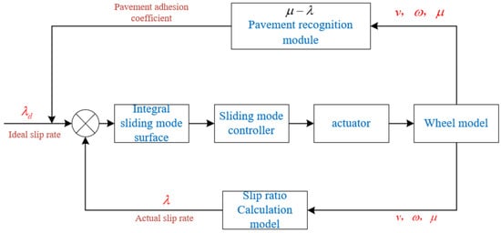 In this section, in order to verify whether the proposed integral sliding mode control algorithm can better converge the error and weaken the buffeting of the system, based on the designed dynamic model of the mobile robot and the improved approach law integral sliding mode controller model, the anti-lock control system model of the mobile robot is built in Matlab/simulink (R2020b). In the braking simulation, the mobile robot’s initial speed was specified as 20 m/s. Figure 4 is the block diagram of the control system.