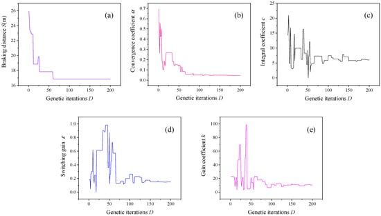 Changes in parameters during genetic algorithm optimization process: (a) braking distance S, (b) convergence coefficient α, (c) integral coefficient c, (d) switching gain ε and (e) gain coefficient k.