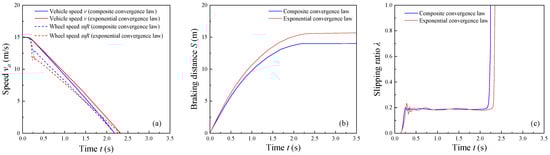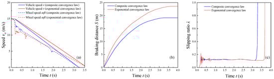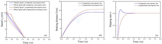 As can be seen from Figure 6, when the ABS adopts the exponential convergence law integral sliding-mode control algorithm, the wheel speed changes in the early stage are large, and the maximum error rate is 21.2%. When the composite convergence law integral sliding-mode control algorithm is used, the wheel speed change is smooth, and the actual slipping ratio can follow the desired value better, and the maximum error rate is 9.1%. Moreover, the difference between the two in terms of the time required and the distance driven from the start of braking to stopping is not significant. Therefore, compared with the exponential convergence law sliding-mode algorithm, the integral sliding mode algorithm regulated by a composite convergence law has a better control speed, improves the system jitter problem, and has a good control effect.