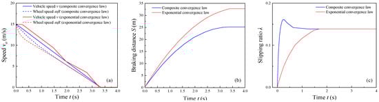 The real vehicle condition of emergency braking under a wet road surface is shown in Figure 11. Figure 11a shows the variation curve of vehicle speed and wheel speed with time, Figure 11b shows the variation in braking distance in the braking process, and Figure 11c shows the variation in slipping ratio in the braking process. Under this condition, in the early stage of braking, the exponential convergence law sliding-mode control wheel speed change fluctuates greatly. And the fluctuation of wheel speed change in the composite convergence law integral sliding-mode control is relatively smaller. In terms of tracking the slipping ratio, in 0~0.45 s, the tire slipping ratio based on the composite convergence law integral sliding-mode control quickly tends to be stable, and in 0.45~3.2 s, the vibration phenomenon is controlled more smoothly, and the slipping ratio is tracked quickly and accurately. While the exponential convergence law sliding-mode control in t = 0.75 s when the slipping ratio converges to the target value, the response time is longer, and the slip value fluctuates more near the target value. Compared with the exponential convergence law sliding-mode control, the composite convergence law sliding-mode control strategy has better safety under the braking condition of a wet asphalt road. In conclusion, the proposed ABS control strategy is robust enough to work in different conditions.