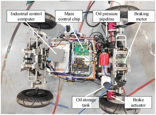 According to the experimental conditions, since the mass of the mobile robot is lower than that of a conventional vehicle, only braking the rear wheels can meet the expected braking performance requirements. In this experiment, the braking system applies braking force to the two rear wheels of the mobile robot through a hydraulic transmission. Two sets of test conditions, dry and wet road surfaces, are selected as the target road surfaces for the ABS emergency braking test. The mobile robot is accelerated to 15 m/s along a straight line and starts emergency braking until the vehicle stops, and the results are observed.