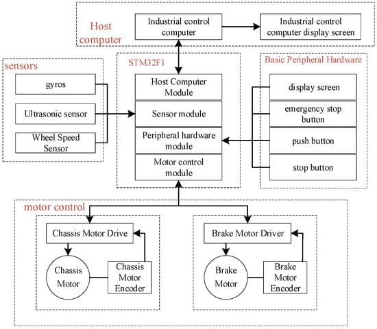 The mobile robot system can be summarized as a motion unit, a perception unit, human–computer interaction, and the schematic diagram of the mobile robot system is shown in Figure 9. The motion unit is the motor, which provides power for each moving part of the mobile robot. In the perception unit, the gyroscope detects the robot speed information and provides data for the mobile robot traveling speed and attitude control, the speed sensor detects the wheel angular speed change and provides data for slipping ratio calculation, and the motor encoder records the motor speed. The STM32F1 is used to receive data and transmit commands to the controller.