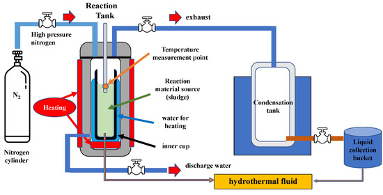 This system is designed for HTL (Figure 2) experiments, with the reaction tank (10 L) having an operational volume of 8 L as its core component. Inside the reaction tank, an inner cup is used to hold sludge as the reactant, with water serving as the reaction medium. Surrounding the inner cup is a heating water layer, which provides thermal energy via a heating device to raise the temperature to 100–300 °C, promoting the reaction process. The system is connected to a high-pressure nitrogen cylinder, which injects inert nitrogen gas into the reaction tank to create an oxygen-free environment and increase pressure. A temperature measurement point is installed inside the reaction tank to monitor temperature changes in real-time, ensuring the precise control of reaction conditions. During the reaction, gases are discharged through an exhaust port into a condensation tank, where they cool and liquefy. These liquids, potentially containing soluble organic compounds and by-products, are collected in a bucket. The system also has an outlet for wastewater ejection post-reaction, preventing accumulation that could affect future operations. The process involves loading sludge into the reaction tank, injecting nitrogen, heating to the desired temperature, conducting the reaction, cooling, and collecting the product. By adjusting the temperature and pressure, this system allows for the study of sludge liquefaction behavior and product characteristics, as well as assessing its impact on anaerobic digestion efficiency.