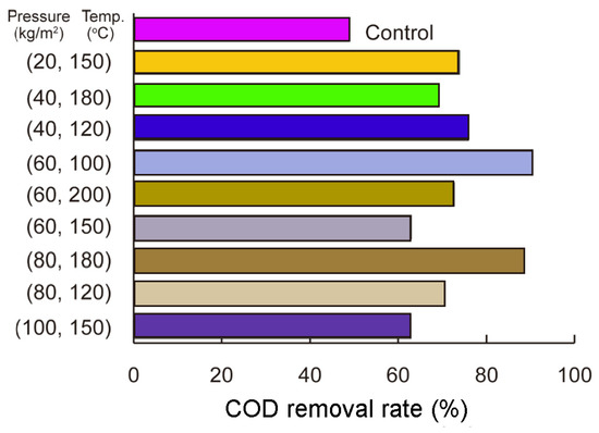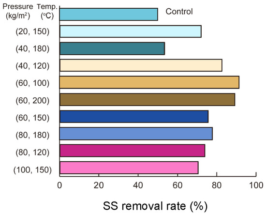 Figure 5 indicates that the SS removal rate peaked at 91.5% under conditions of 60 kg/m2 pressure and 100 °C, highlighting the role of moderate pressure at lower temperatures in improving removal efficiency. At 150 °C, the removal rate dropped to 72.1% (20 kg/m2), 75.7% (60 kg/m2), and 70.6% (100 kg/m2), suggesting that pressure changes had a minimal effect and might even reduce efficiency at this temperature. In contrast, at 180 °C, increasing the pressure from 40 kg/m2 to 80 kg/m2 raised the SS removal rate from 53.6% to 77.8%, illustrating the beneficial impact of higher pressures at elevated temperatures. At 200 °C, an SS removal rate of 88.8% was achieved at 60 kg/m2 pressure, underlining the critical need for accurate pressure regulation to achieve optimal results under high-temperature conditions.