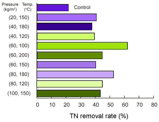 TN removal during HTL pretreatment under varying pressures and temperatures: TN removal peaked at 62.1% at 100 °C and 60 kg/cm2. At 150 °C, pressure had minimal effect, while at 180 °C, higher pressure increased removal to 52.7%. Efficiency decreased to 44.8% at 200 °C.