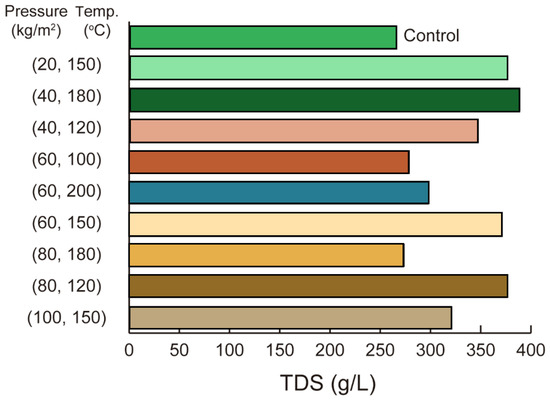 TDS concentrations under various pressure and temperature conditions: higher pressure and temperature (e.g., 100 kg/cm2, 150 °C) yield the highest TDS concentration (~400 g/L), while lower conditions (e.g., 20 kg/cm2, 150 °C) result in significantly lower concentrations.