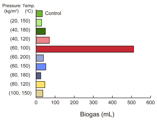 These results are in line with the observations of Dhar [28], who showed that the slow hydrolysis step limits anaerobic digestion, while volatile sulfur compounds degrade biogas quality and harm equipment. To address these challenges, pretreatment methods are critical for improving efficiency and reducing harmful emissions. The findings in Figure 3 correspond with Dhar’s conclusions, as HTL pretreatment was shown to enhance sludge degradability and boost COD removal efficiency. The observed conditions of 100 °C and 60 kg/cm2, together with the detrimental effects of excessive pressure at 150 °C and the positive impact of increased pressure at 180 °C, highlight the importance of optimizing pretreatment parameters. Dhar’s work provides theoretical support for the experimental outcomes in Figure 3, reinforcing the role of HTL pretreatment in advancing anaerobic digestion processes.