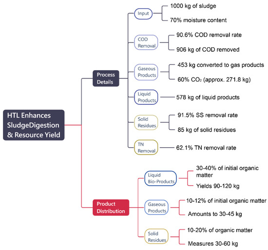 HTL is an innovative process designed to convert high-solid organic sludge into valuable outputs such as liquid bio-products, gaseous compounds, and solid residues under precisely controlled high-temperature and high-pressure conditions. Figure 8 illustrates that starting with 1000 kg of sludge at 70% moisture content, the process achieves an impressive 90.6% COD removal rate, effectively transforming the majority of organic matter into gaseous and liquid products.
