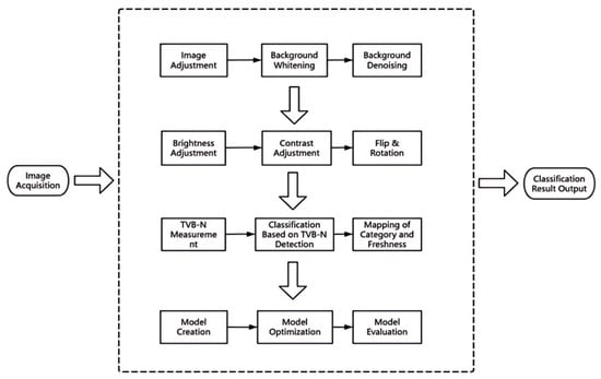 In this study, GoogLeNet was selected as the base model. By incorporating residual modules, the network depth is increased while effectively preventing gradient vanishing. The overall framework of the proposed approach is shown in Figure 3. After image acquisition, the data undergoes preprocessing and augmentation. Images are then classified into freshness levels based on physicochemical indicators. The base network is subsequently optimized and improved to build a high-performance model, which is finally deployed on mobile devices.
