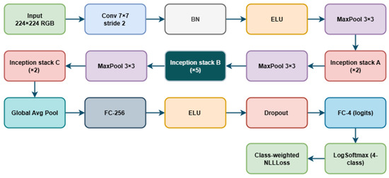 The backbone was an enhanced GoogLeNet: a 256-unit fully connected layer was inserted before the classifier, ELU replaced ReLU, and regularization was applied to trainable weights to suppress overfitting. Transfer learning used ImageNet initialization with a two-stage schedule: a 10-epoch head warm-up with the convolutional backbone frozen, followed by 120 epochs of full fine-tuning (130 epochs in total) with a cosine-annealed learning rate. Optimization used RMSProp (initial learning rate 3 , , ) with weight decay 1 . To address moderate class imbalance, a class-weighted negative log-likelihood loss was employed, with per-class weights set inversely proportional to class frequency (see Section 2.4). The batch size was 32. A class-stratified 10% subset of the training split was held out as the validation set for early stopping (patience of 10 epochs) and learning-rate scheduling; the test set was fixed and not used for model selection. Training and validation losses were monitored at every epoch, and the final model was taken as the checkpoint corresponding to the minimum validation loss, ensuring stable convergence of the reported results. For reproducibility, five runs with different random seeds (2021–2025) were conducted, reporting accuracy, macro-precision/recall/F1, and Cohen’s as mean ± SD, together with confusion matrices for error analysis. Performance was summarized as mean ± SD across runs; improvements over the baselines were assessed using paired t-tests, or Wilcoxon signed-rank tests when normality was not satisfied (significance level ).