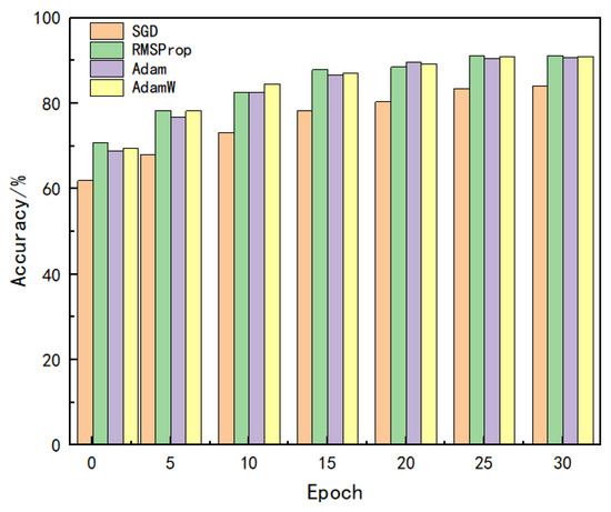 To evaluate the overall effectiveness of different optimization algorithms in terms of training convergence speed, accuracy performance, and loss control, four mainstream optimizers—SGD, RMSProp, Adam, and AdamW—were selected for comparative experiments. All experiments were conducted under the same network architecture, dataset split, and number of training epochs (30 in total). Only the optimizer parameter was varied, while other hyperparameters remained constant to ensure a fair comparison. Figure 7 presents a bar chart comparing the final accuracy achieved by each optimizer. RMSProp achieved the best result at 91.2%, followed by AdamW and Adam, while SGD yielded the lowest accuracy. Overall, both RMSProp and AdamW showed faster convergence in the early training stages, with steadily improving accuracy and consistently better performance. In contrast, SGD converged more slowly and exhibited larger accuracy fluctuations, resulting in suboptimal final performance. For loss comparison, Figure 8 illustrates the training loss curves of each optimizer, with values recorded every five epochs. It can be observed that RMSProp and AdamW achieved faster loss reduction and demonstrated greater stability in the later stages, ultimately converging to lower loss levels. SGD, on the other hand, experienced larger fluctuations during training and struggled to reduce loss effectively, indicating poorer convergence.