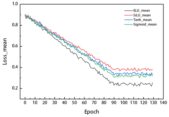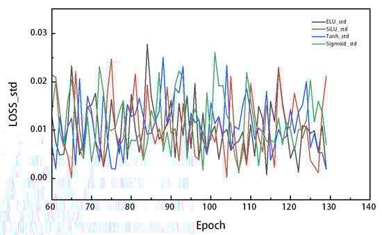 To verify the impact of different activation functions on model performance, four representative functions—ELU, SiLU, Tanh, and Sigmoid—were selected. Under identical model architecture and training parameter settings, three independent experiments were conducted for each function. In addition to focusing on the average loss value, this section also introduces the standard deviation (SD) as a supplementary metric. While the average loss value reflects the overall prediction error across all test samples, relying on this metric alone may not provide a comprehensive assessment of model stability, especially when the loss varies significantly. The standard deviation quantifies the dispersion of the loss values and helps evaluate the consistency of model performance across different samples. A high standard deviation may indicate that the model performs unevenly across the dataset, potentially signaling a risk of overfitting. Therefore, by jointly considering both the average loss and standard deviation, we can more comprehensively assess the model’s accuracy and stability. Figure 9 and Figure 10 show the variation of average loss and corresponding standard deviation intervals across 130 training epochs for each activation function. The results reveal that the ELU activation function outperformed the other three in both convergence speed and final loss value. In the early training stages, the ELU-based model exhibited a faster decline in loss, entering convergence earlier. In the later stages, the loss curve stabilized at a relatively low level, with a final average loss of 0.24 and a standard deviation of approximately 0.015, indicating good robustness and consistency. In contrast, SiLU, Tanh, and Sigmoid showed slightly slower convergence, with final loss values stabilizing at 0.38, 0.34, and 0.32, respectively, and greater fluctuations compared to ELU. Although these functions also showed a degree of stability in later training stages, they were slightly inferior in both loss reduction and convergence quality. Results from multiple experimental rounds confirm that the superior performance of ELU is statistically consistent and not accidental. This may be attributed to ELU’s ability to maintain a non-zero derivative for negative inputs, which alleviates the vanishing gradient problem while retaining the sparsity advantage of ReLU, thus making the model easier to optimize.