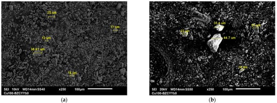 The treatment with acids does not cause significant changes in the external morphology of the zeolite particles, as observed in the SEM images (Figure 7). The background visible in the micrographs corresponds to the carbon tape used for sample mounting. However, the surface becomes more textured, and internal pores are more clearly opened, which may enhance the catalytic performance of the samples. In the untreated natural zeolite (Figure 7a), the particle size ranges from approximately 12 to 35.41 μm, with a mixture of small, medium, and large particles. The surface structure appears relatively compact with limited surface roughness.