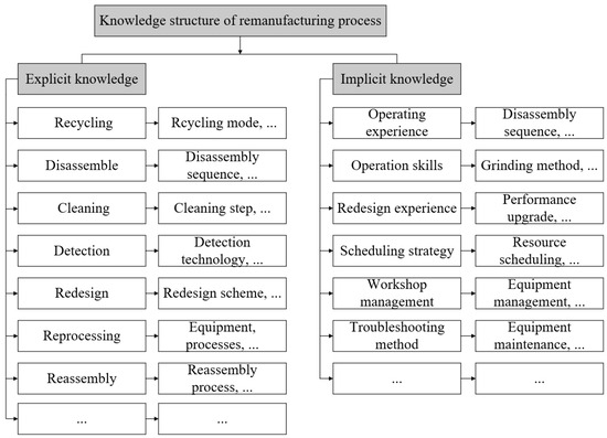 Remanufacturing knowledge can be divided into two categories: explicit knowledge and implicit knowledge. Explicit knowledge includes knowledge related to recycling, dismantling, and reprocessing, while implicit knowledge is not easily discovered and requires analysis and extraction through technologies such as data mining and cluster analysis. It mainly includes design experience, operational skills, and management experience. The specific knowledge structure is shown in Figure 2.
