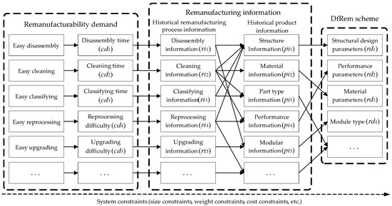 The remanufacturing information not only includes performance recovery or upgrading information but also includes the physical information of the used products. To construct the mapping relationship between remanufacturing information and DfRem parameters, it is necessary to establish the relationship between remanufacturability demand and remanufacturing information, as well as between remanufacturing information and DfRem parameters.