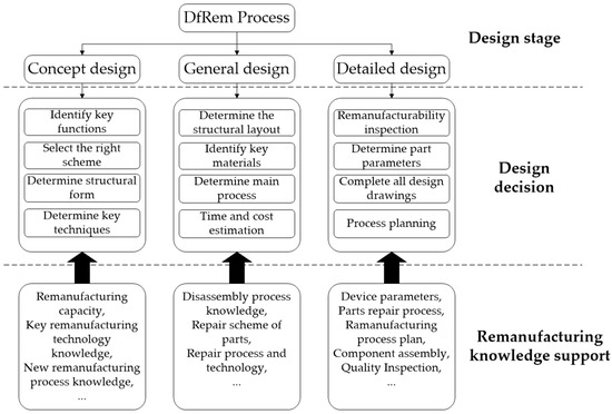 Due to the distinct targets and tasks inherent to each DfRem stage, the specific content and depth of remanufacturing knowledge required for design decisions vary significantly. Early conceptual stages may focus on modularity principles, while detailed design demands precise insights into material recovery or component repair techniques. These stage-specific knowledge variations are illustrated in detail in Figure 4.